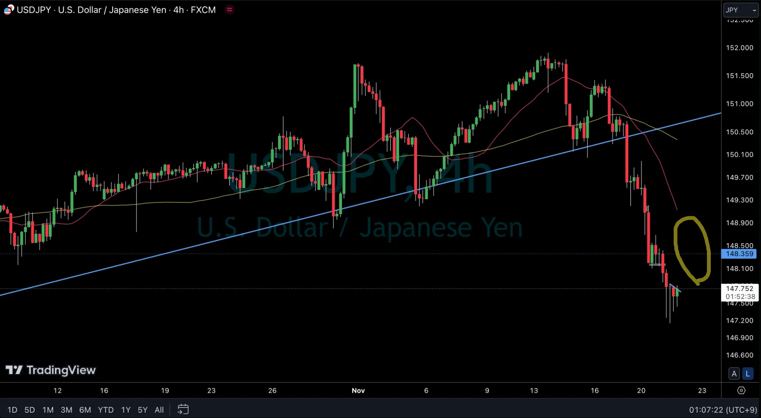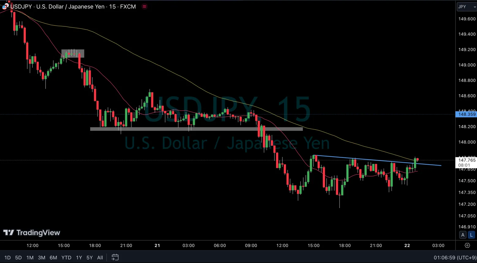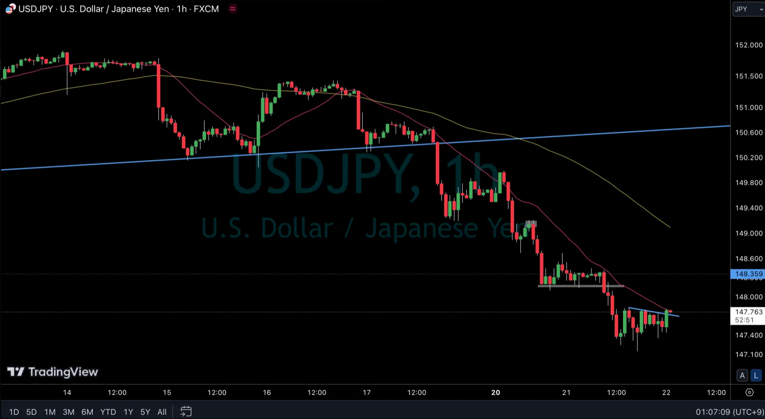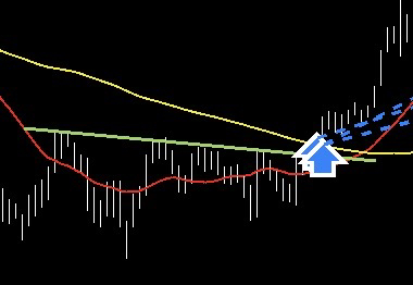1時間足、maに押さえられて下落してきたところ、節目を青ラインで揃えてきたので、今回は売り手の決済も巻き込んで上抜けなるか