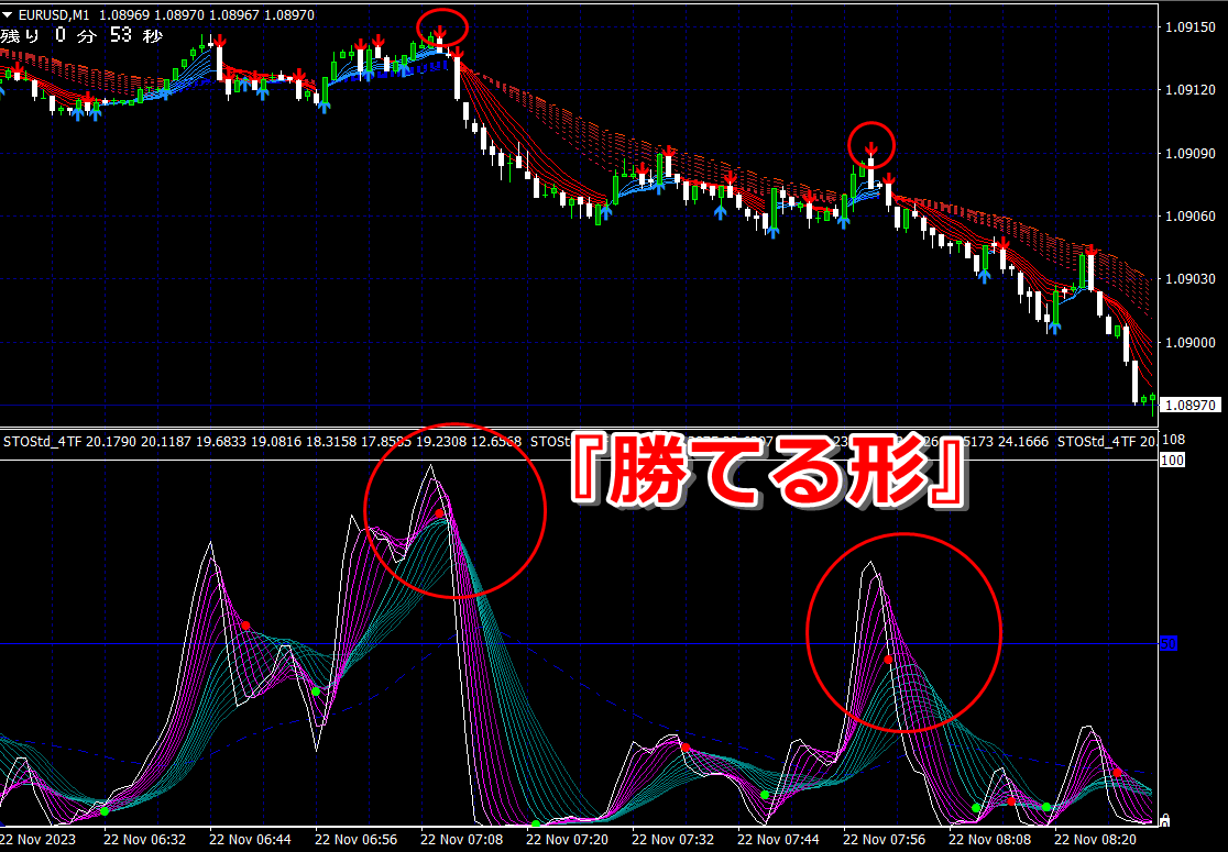 ② 矢印サイン点灯状態で、インジケーターのピンク色の帯が、緑の帯を下からすくい上げるような形状であれば、現在のローソク足が確定する数秒前か確定の直後に1分判定または3分判定でハイエントリーします。