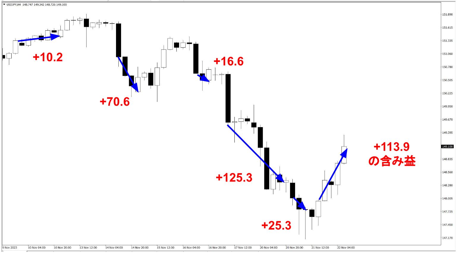 執筆時におおよそ113pipsくらいの含み益が出ている状態です。