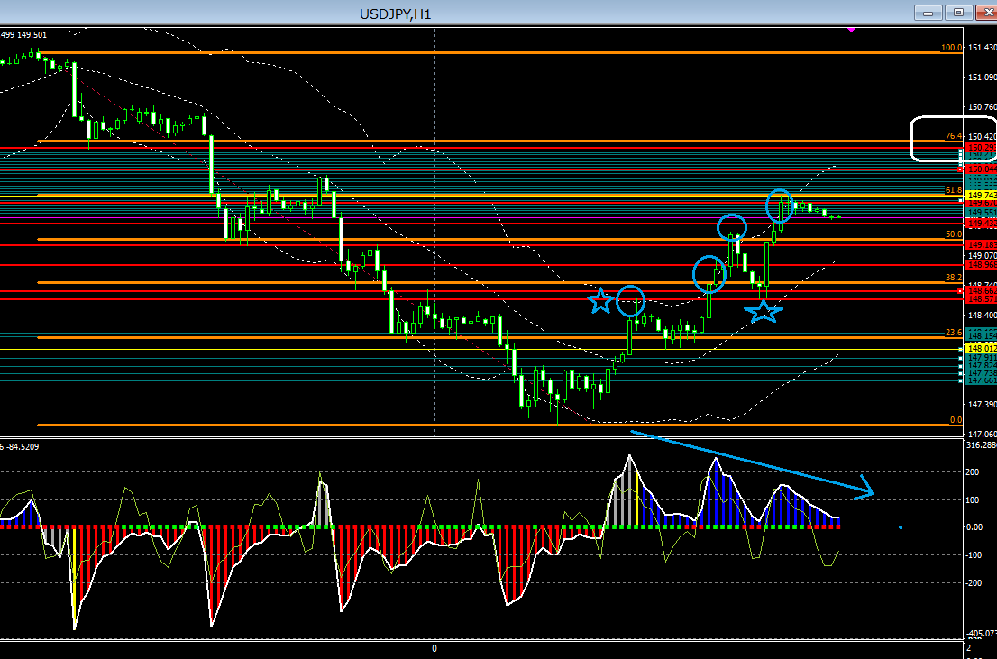 そして下記チャートは、ドル円1時間足チャートです。