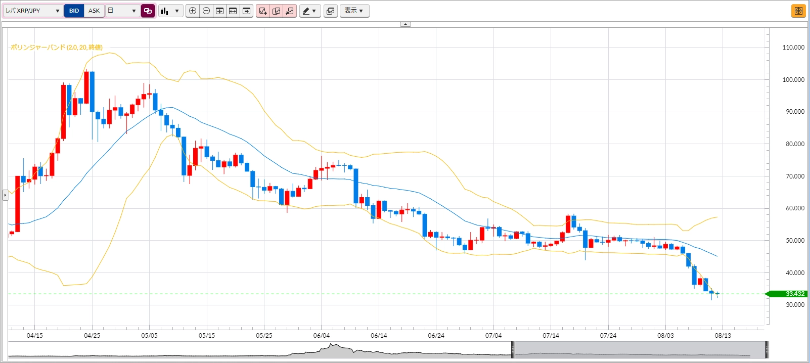 8月11日投稿の「下げの勢い止まらず、約60万円どころの攻防へ」では、4月につけた安値約63万円を下回ってぐんぐんと安値更新をしている状況と、ボリンジャーバーンがエクスパンションしてマイナス2σに沿っての進行とあって、その勢いはそう簡単に止まりそうもないとお伝えしました。実際には安値を更新しましたが、それから下ヒゲをつけて陽線で終える結果に。とはいえバンドウォークを継続している格好です。今日は下値を更新するかどうかに注目です。