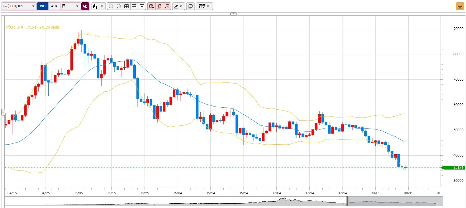 8月11日投稿の「33円どころでサポートされなければ底なし沼へ」では、日足の大きなディセンディングトライアングルを下にブレイクした後、ボリンジャーバンドのマイナス2σに沿って下値を更新、33円どころは2017年後半に高値決まりしていた水準であると述べました。昨日はこの水準に踏みとどまったものの、小ぶりな陰線を形成。依然として下方向へのバンドウォークが継続しており、33円どころの攻防がいつ勃発してもおかしくない状況となっています。このラインを下に抜けてしまうと、そのインパクトは大きいといえます。