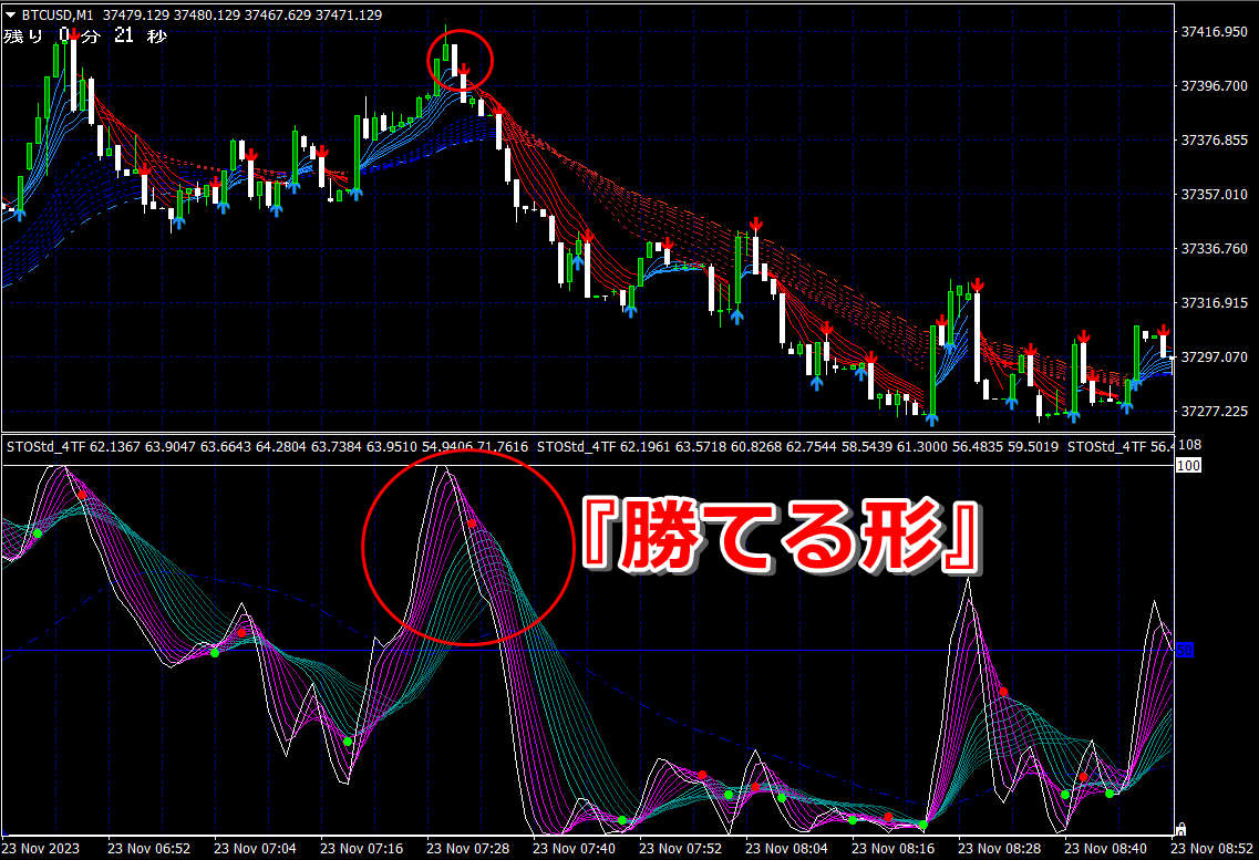 ② 矢印サイン点灯状態で、インジケーターのピンク色の帯が、緑の帯を下からすくい上げるような形状であれば、現在のローソク足が確定する数秒前か確定の直後に1分判定または3分判定でハイエントリーします。
