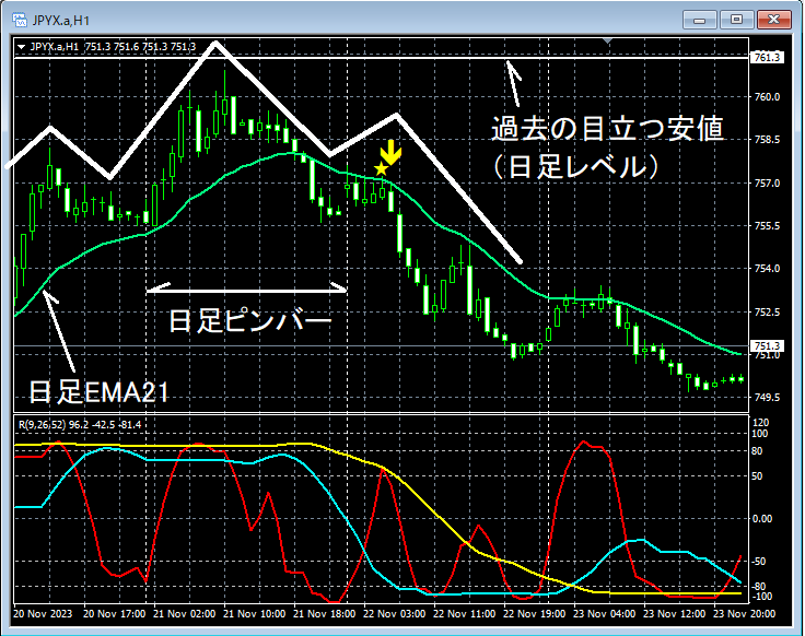 日足でピンバーを形成中に、上の1時間足では、1時間足EMA21を下抜けており、日足の状況を考え合せると、下落の可能性が高くなっていると言えるかもしれない。