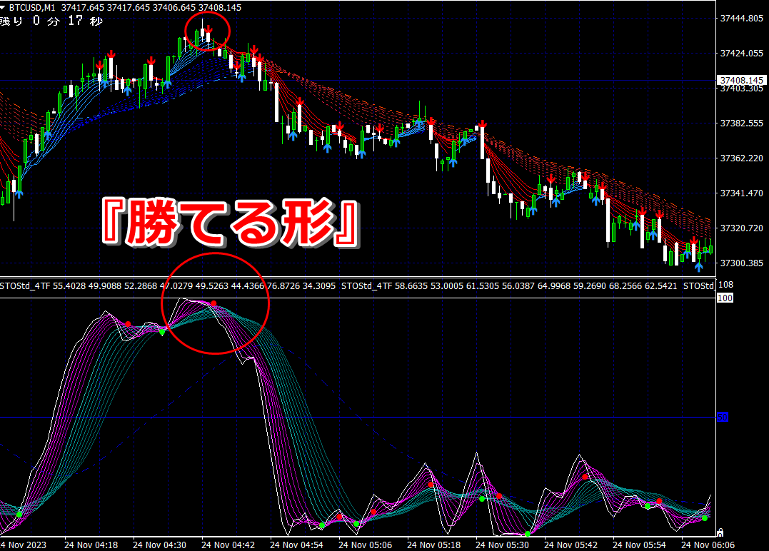 ② 矢印サイン点灯状態で、インジケーターのピンク色の帯が、緑の帯を下からすくい上げるような形状であれば、現在のローソク足が確定する数秒前か確定の直後に1分判定または3分判定でハイエントリーします。