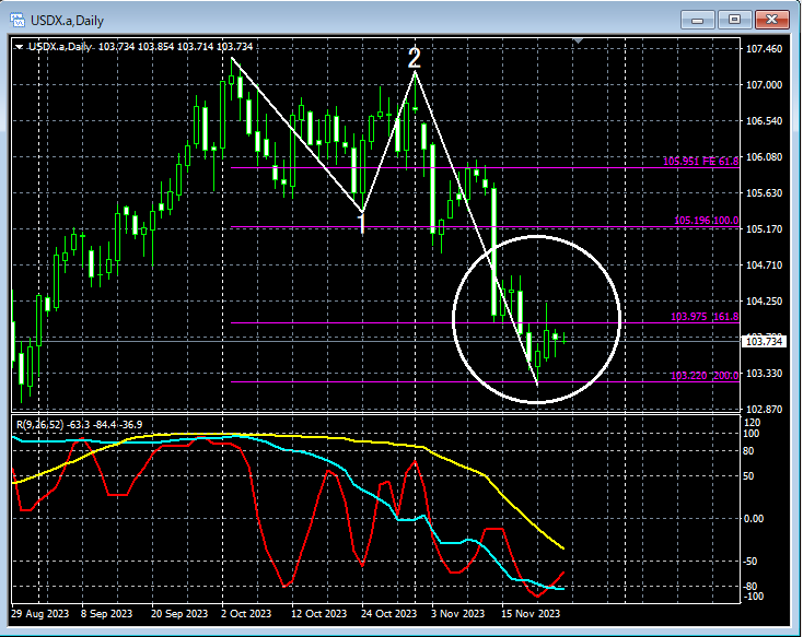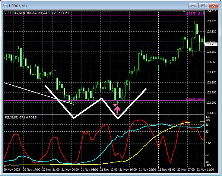 ドルインデックス:フィボナッチリトレースメントとフィボナッチエクスパンションとmBDSR(RCI2本フィルター)のサインとダブルボトム