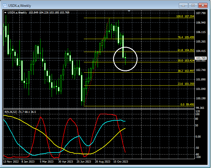 上の週足で白い円で囲ったあたりを見るとフィボナッチリトレースメント50.0%付近まで下げていることが分かる。