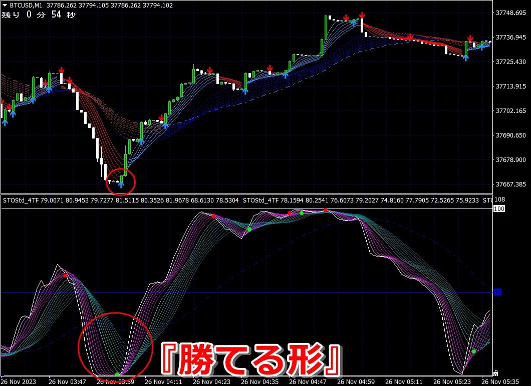 ② 矢印サイン点灯状態で、インジケーターのピンク色の帯が、緑の帯を下からすくい上げるような形状であれば、現在のローソク足が確定する数秒前か確定の直後に1分判定または3分判定でハイエントリーします。