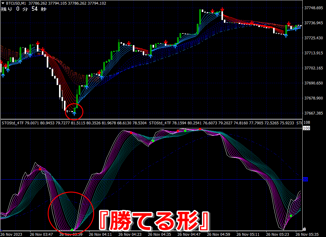 ② 矢印サイン点灯状態で、インジケーターのピンク色の帯が、緑の帯を下からすくい上げるような形状であれば、現在のローソク足が確定する数秒前か確定の直後に1分判定または3分判定でハイエントリーします。