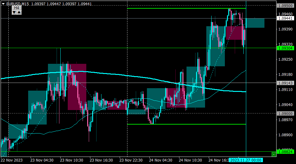 〇前日のトレード・USDJPY ドル円(15分足)昨日は先週安値141.50付近での値動きにとどまったためノートレード。・EURUSD ユーロドル(15分足)昨日は1.090付近でのプライスアクション