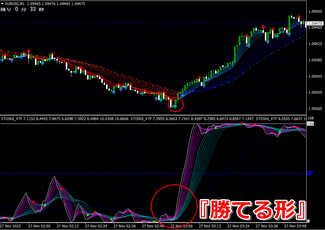 ② 矢印サイン点灯状態で、インジケーターのピンク色の帯が、緑の帯を下からすくい上げるような形状であれば、現在のローソク足が確定する数秒前か確定の直後に1分判定または3分判定でハイエントリーします。