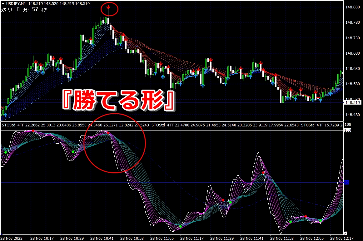 ② 矢印サイン点灯状態で、インジケーターのピンク色の帯が、緑の帯を下からすくい上げるような形状であれば、現在のローソク足が確定する数秒前か確定の直後に1分判定または3分判定でハイエントリーします。