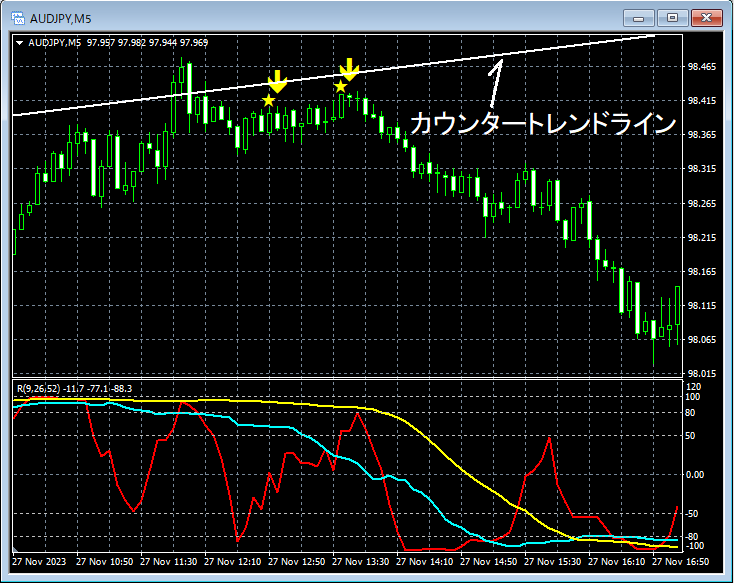 上の5分足では、カウンタートレンドライン付近でmBDSR(フィルター:RCI26とRCI52)が点灯し、その後、プライスは順調に下げていることが分かる。