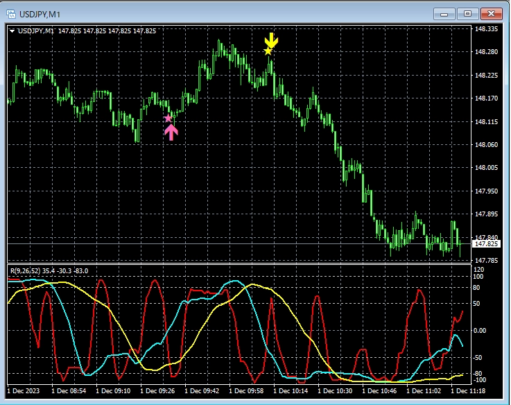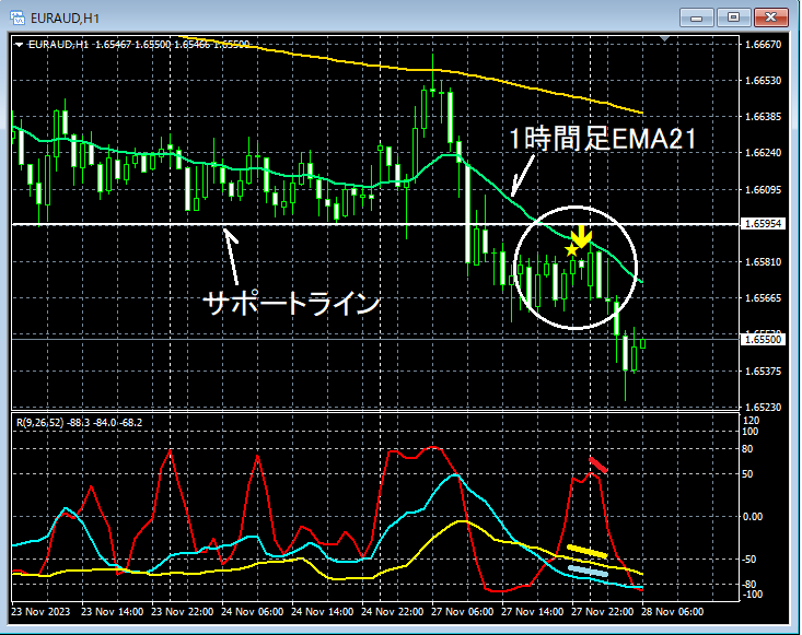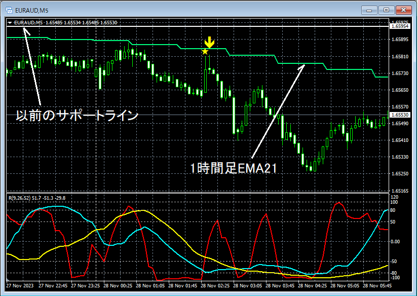 1時間足でRCI3本ラインがそろって下げのとても弱い形となっている中、上の5分足では、1時間足EMA21付近まで戻したところでmBDSR(フィルター:RCI26とRCI52)の戻り売りサインが点灯し、その後、プライスは順調に下げている。