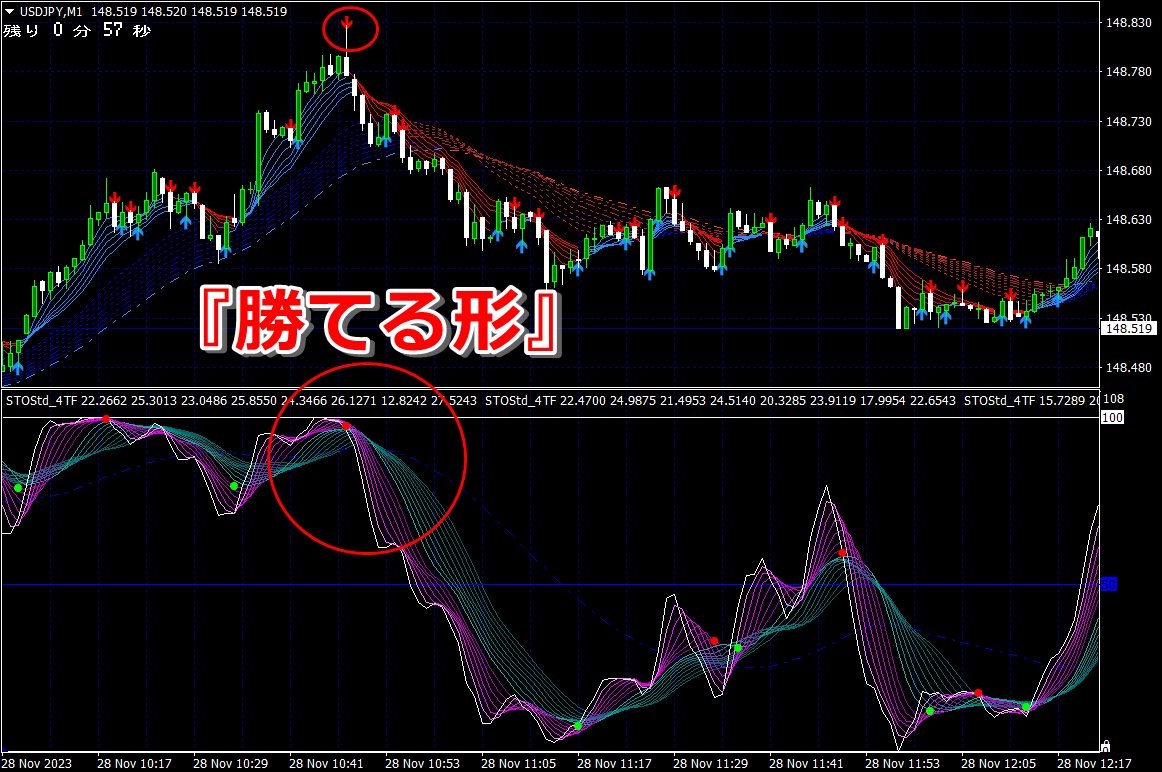 ② 矢印サイン点灯状態で、インジケーターのピンク色の帯が、緑の帯に上から覆いかぶさるような形状であれば、現在のローソク足が確定する数秒前か確定の直後に1分判定または3分判定でローエントリーします。