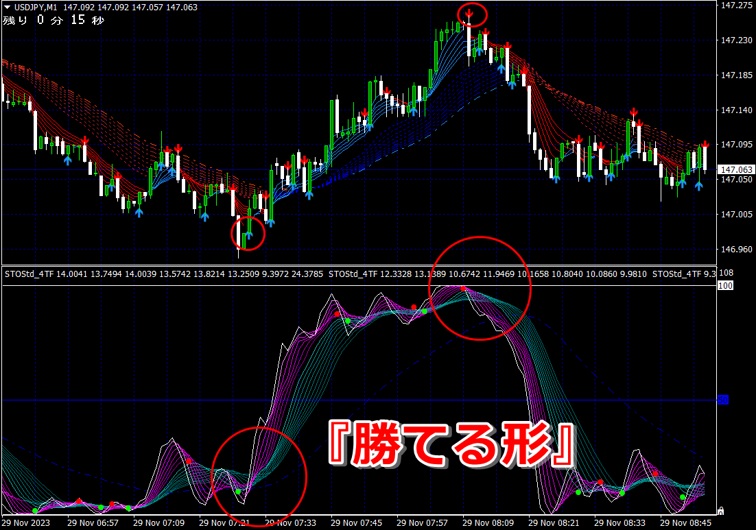※ サイン点灯=エントリーではありませんので、インジケーターが緑帯をすくい上げるような形状でない場合は、エントリーしません(サイン点灯でエントリーできる頻度は、数回に1度くらいです)。