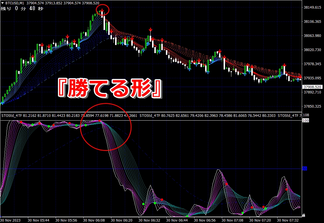 ② 矢印サイン点灯状態で、インジケーターのピンク色の帯が、緑の帯に上から覆いかぶさるような形状であれば、現在のローソク足が確定する数秒前か確定の直後に1分判定または3分判定でローエントリーします。