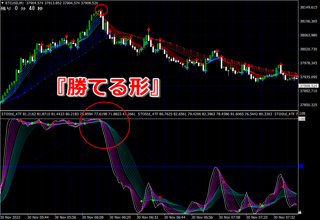 ② 矢印サイン点灯状態で、インジケーターのピンク色の帯が、緑の帯を下からすくい上げるような形状であれば、現在のローソク足が確定する数秒前か確定の直後に1分判定または3分判定でハイエントリーします。