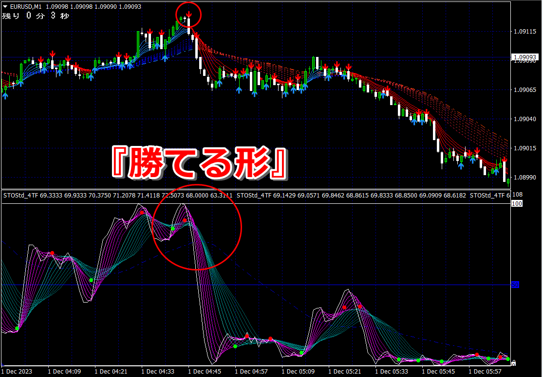 ② 矢印サイン点灯状態で、インジケーターのピンク色の帯が、緑の帯を下からすくい上げるような形状であれば、現在のローソク足が確定する数秒前か確定の直後に1分判定または3分判定でハイエントリーします。