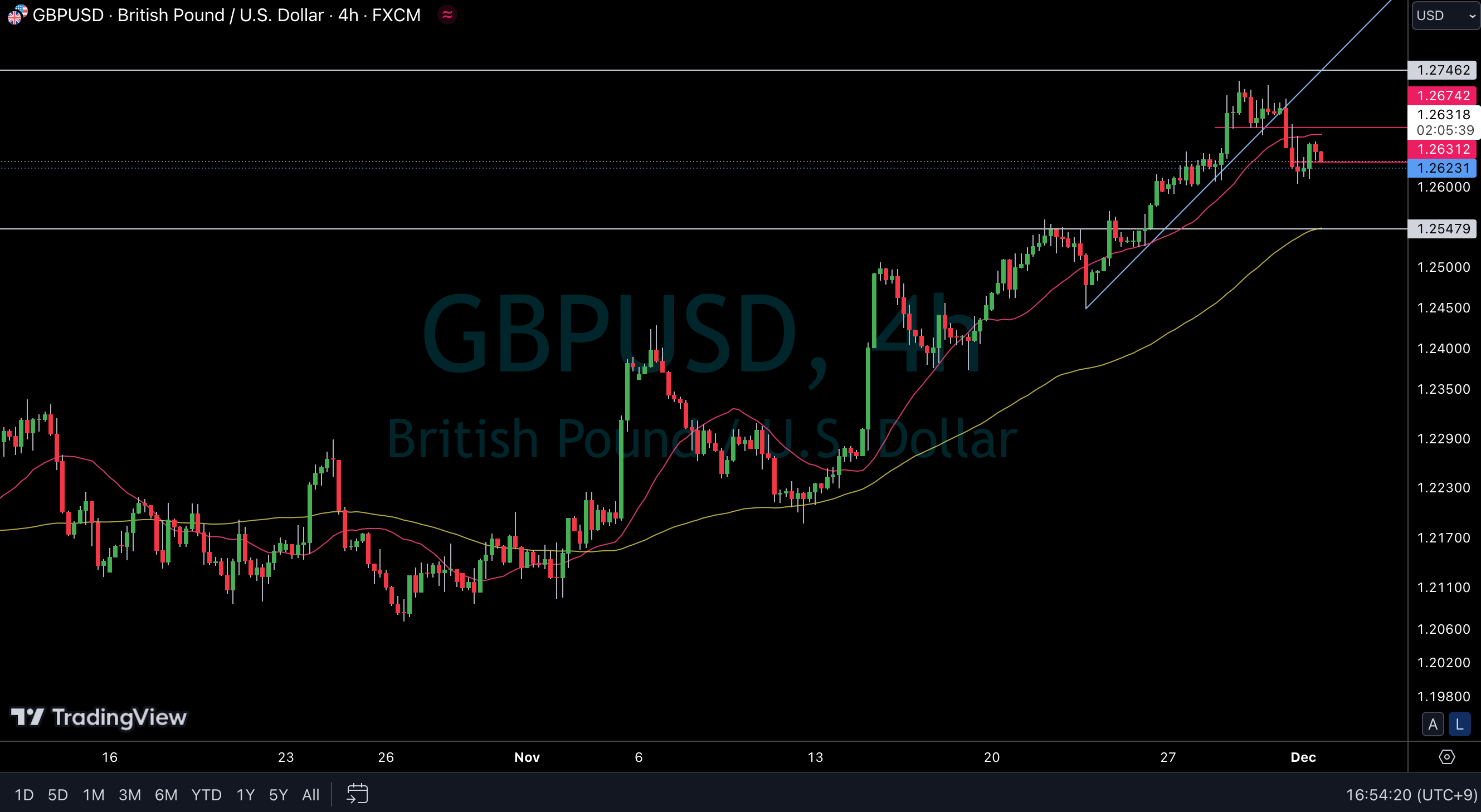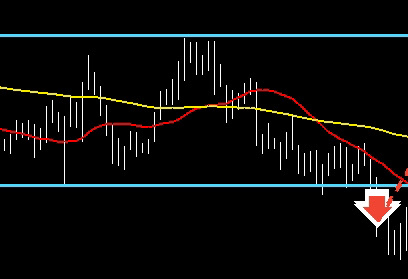 4時間足、安値切り上げラインとmaを下抜け。maが上向きから横ばいに、まだ下を向き始めてはいない。