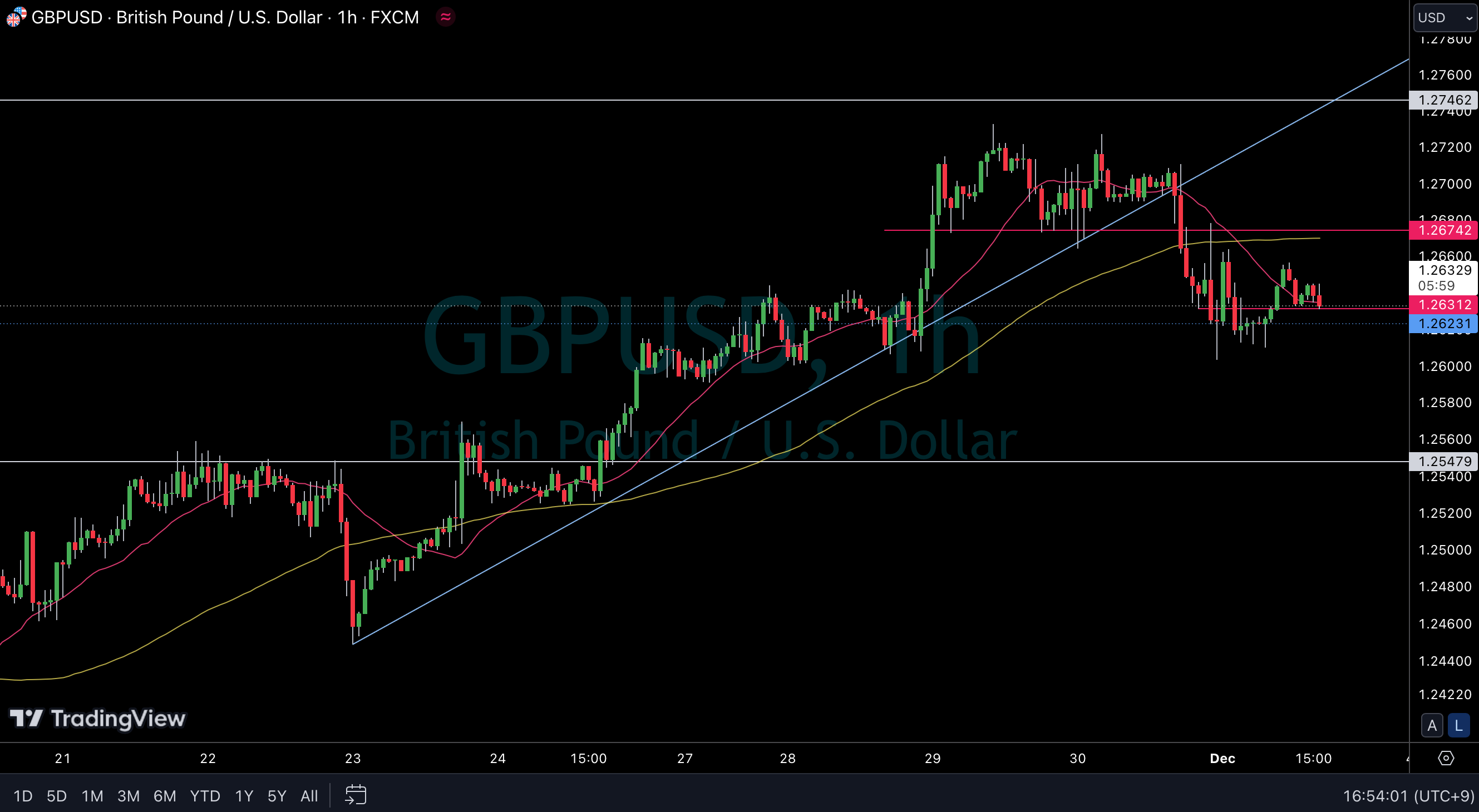 1時間足、上側のピンクラインのサポートを下抜け、戻り売りが入ってきている状況。
