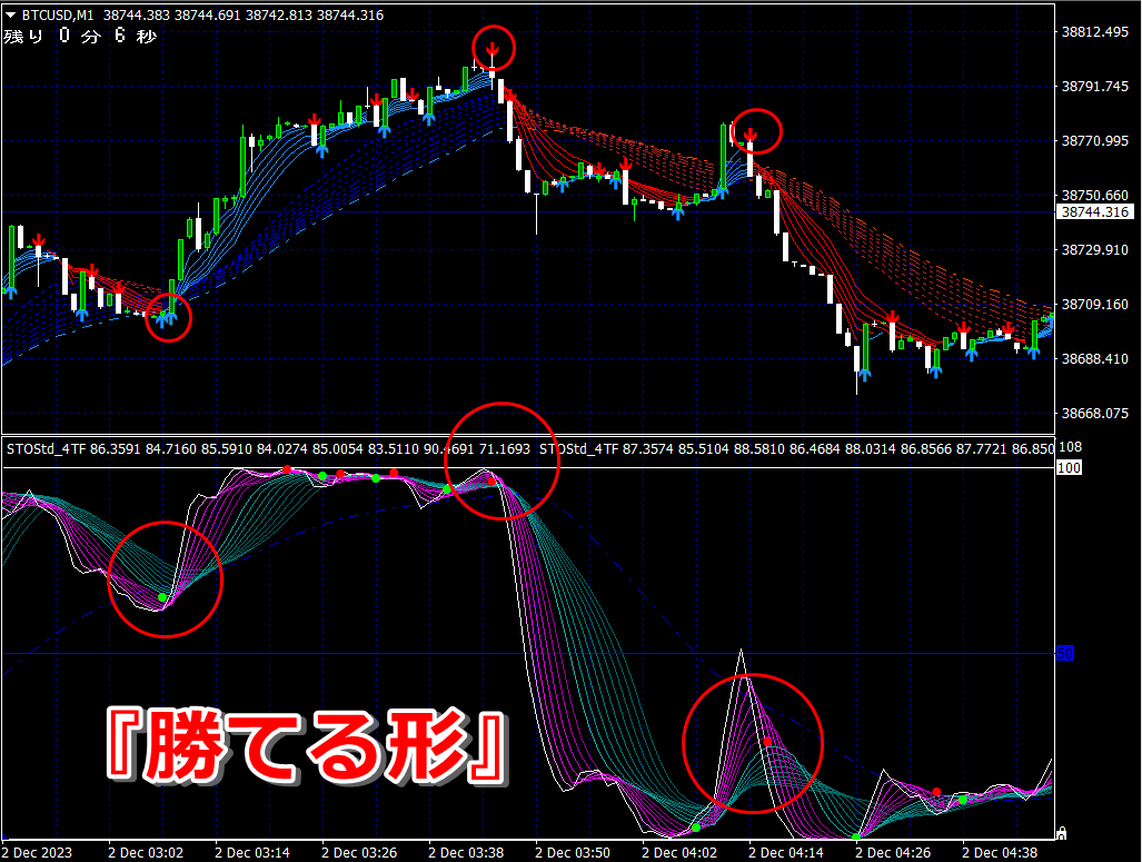 ② 矢印サイン点灯状態で、インジケーターのピンク色の帯が、緑の帯を下からすくい上げるような形状であれば、現在のローソク足が確定する数秒前か確定の直後に1分判定または3分判定でハイエントリーします。