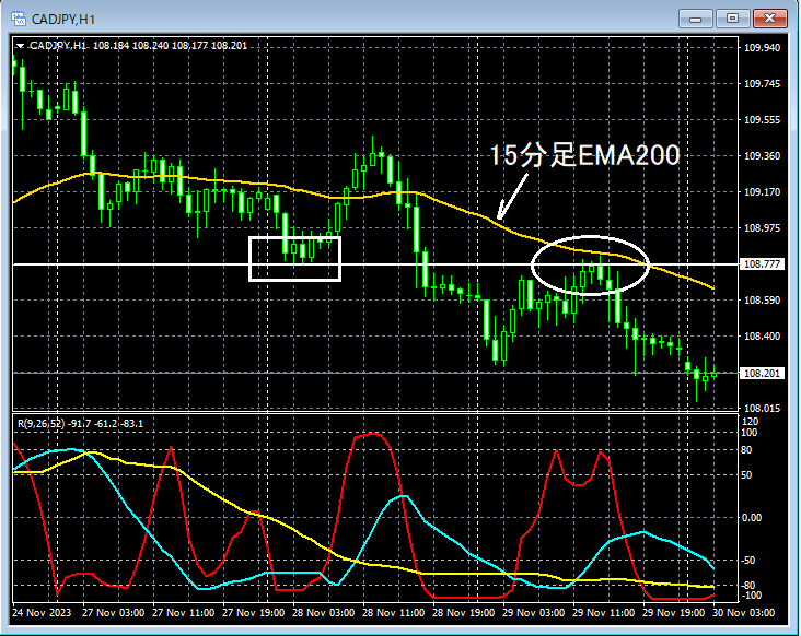 上の1時間足で白い楕円で囲ったあたりを見てみると、以前にサポートとして機能していたラインと15分足EMA200が重なるあたりまで上昇していることが分かる。サポレジ転換から下げる可能性を考えてもおかしくない場面かもしれない。