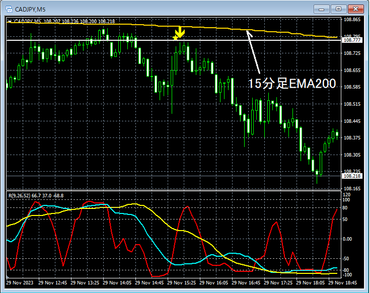 上の5分足では、以前にサポートとして機能していたラインと15分足EMA200が重なるあたりまで上昇したところでmBDSR(フィルター:RCI26とRCI52)の戻り売りサインが点灯し、その後、プライスは順調に下げている。