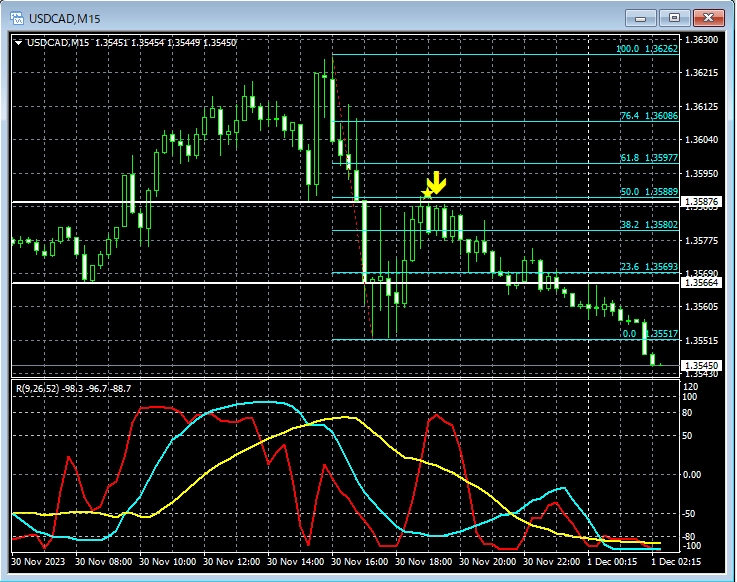 上の30分足では、直近高値付近まで上昇したところでmBDSR(フィルター:RCI26とRCI52)の戻り売りサインが点灯し、その後、プライスは順調に下げている。