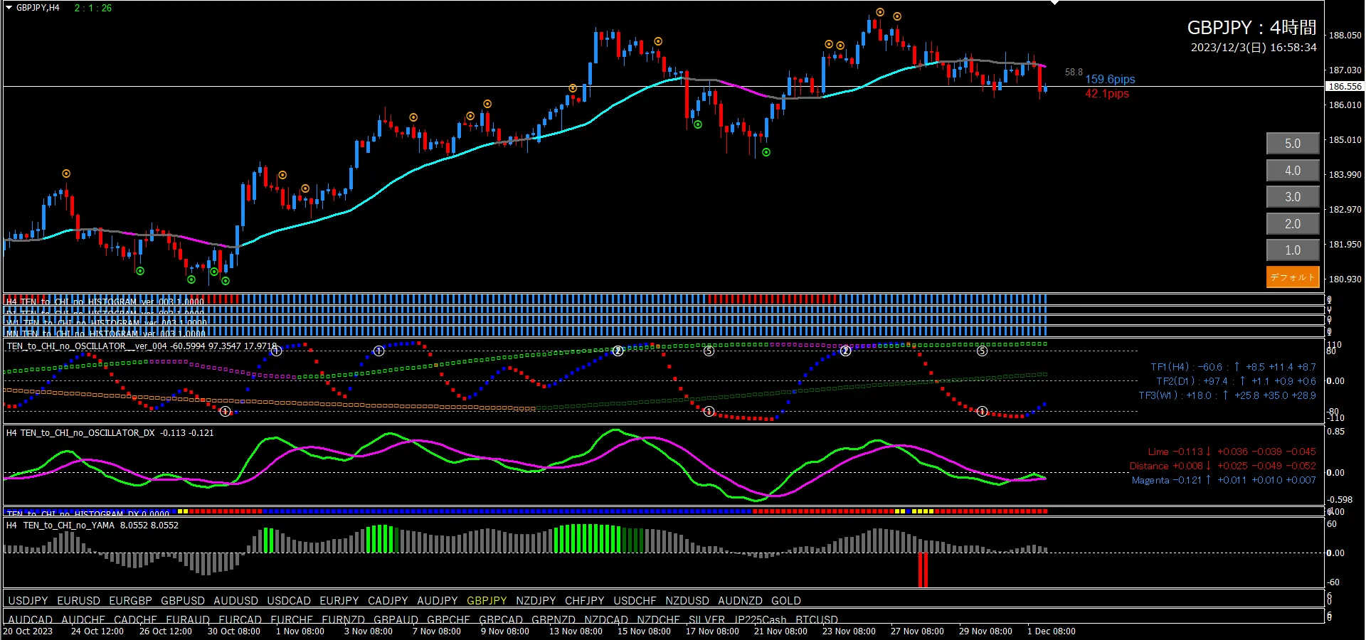 オシレーターTF2が上昇中(途中からの緩やかな上昇なのであまり良い形ではありませんが)、TF1が-80に達しています。オシレーターDXも上昇転換間近です。しかし直前のロング点サイン後に再度下降してしまっています。最低でもあと3.8pips上昇したらロング点サインが再びでます。それを確認したら上目線と判断して良いと思います。
