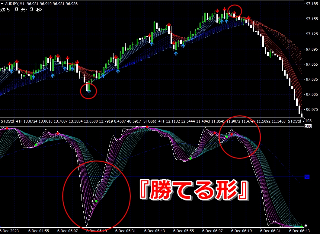 ② 矢印サイン点灯状態で、インジケーターのピンク色の帯が、緑の帯を下からすくい上げるような形状であれば、現在のローソク足が確定する数秒前か確定の直後に1分判定または3分判定でハイエントリーします。