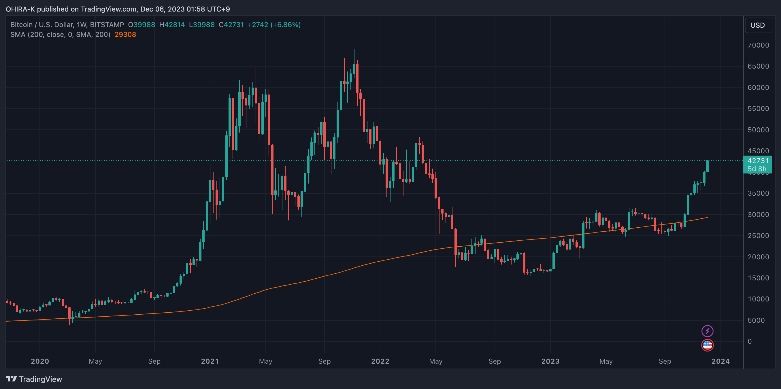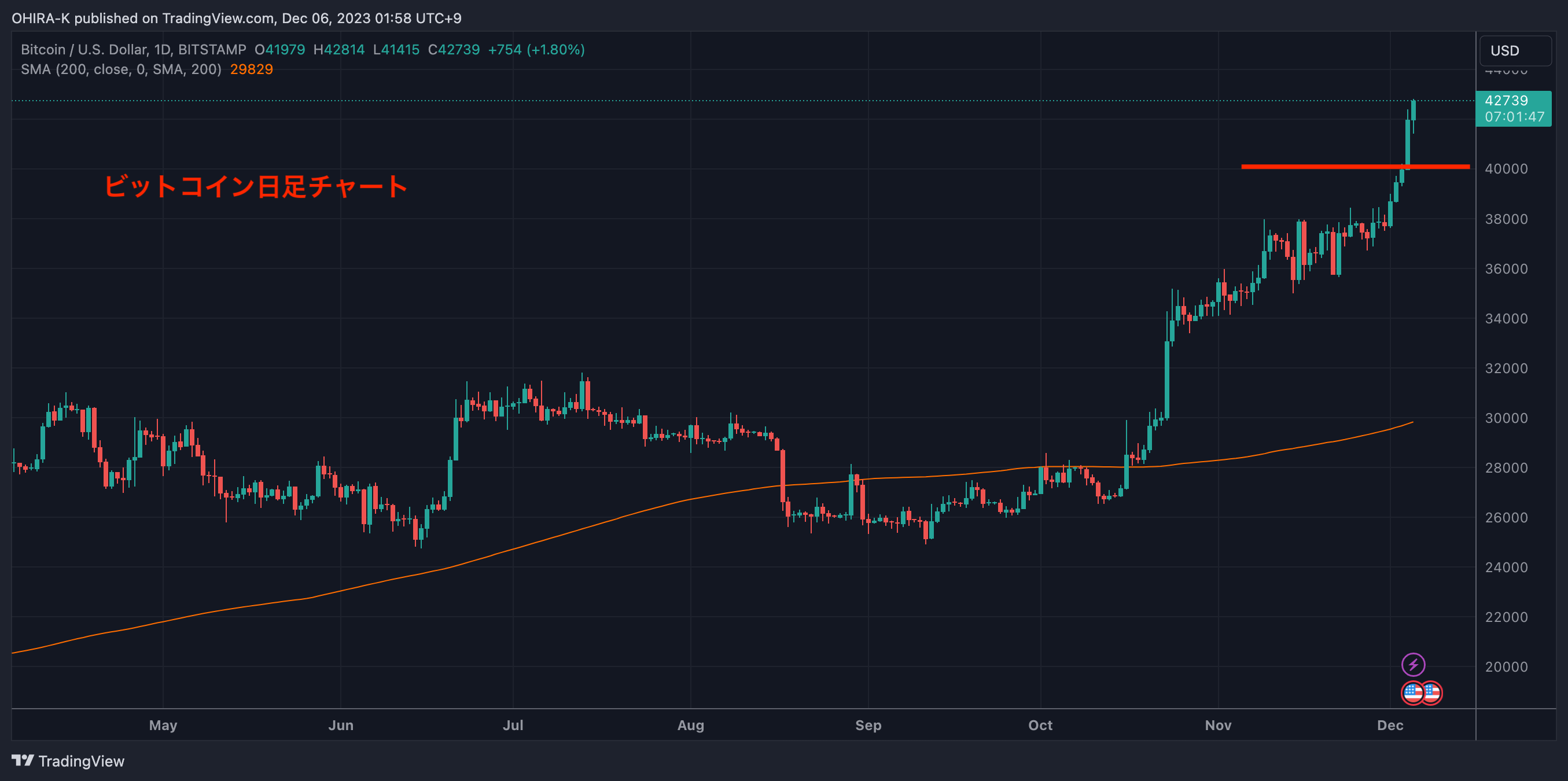 この大きな高騰はビットコインETFの期待ともいわれていますが、果たしてどうなるのか。