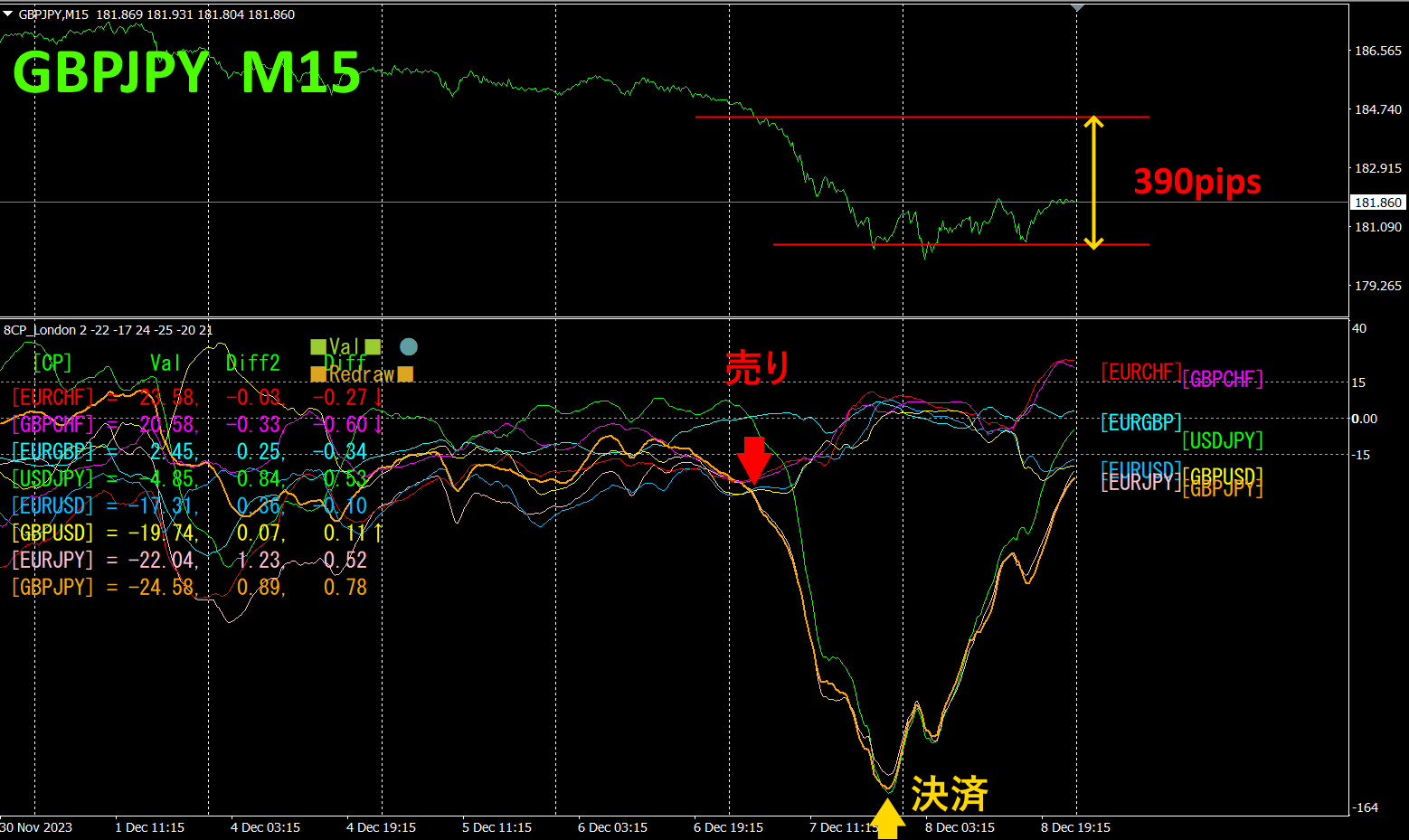 木曜日に、GBPJPY がグラフ群を下に抜けてきたので売りエントリーします。当日、底を打って反転した所で決済します。約390pipsの利益が得られました。「8CP見える化インジケータ」で、最も動きの大きい通貨ペアの動きに注目するだけで、効率的なトレードをすることができます。