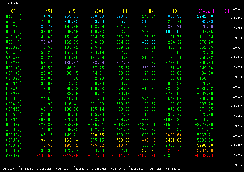 Total数値の降順に並び替えています。最も下の行にあるCHFJPYは、D1を除く全時間足で赤色になっていて、Total数値が-6008.24と極端に大きいマイナスの数字になっています。CHFJPYに極端な下降トレンドが発生していることを示しています。