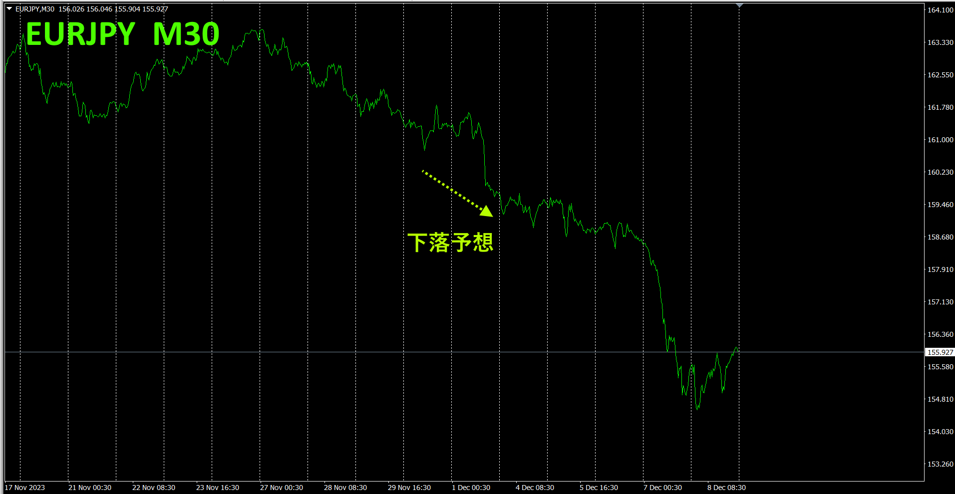 通貨強弱チャートの方向性が継続するのであれば、今後EURJPYはさらに下落する見込みです。