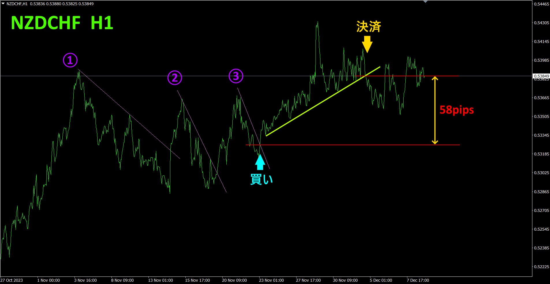 ①、②、③の切り下げラインを上抜けしたら買い、上昇トレンドラインを割り込んだら決済を繰り返してきました。①で40pips、②で60pips、合計で100pipsの利益を既に得ています。③で買ったポジションですが、上昇トレンドラインを割り込んできたので、決済しました。確定利益は58pipsです。