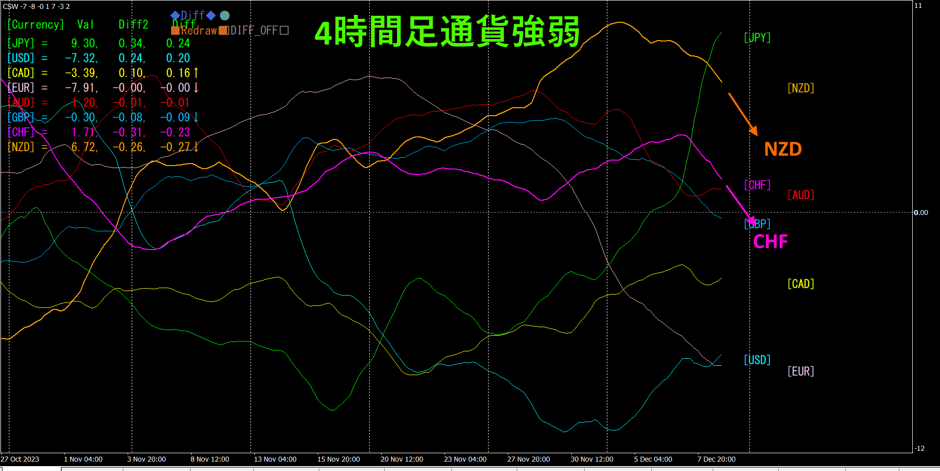 4時間足の通貨強弱チャートを参照します。