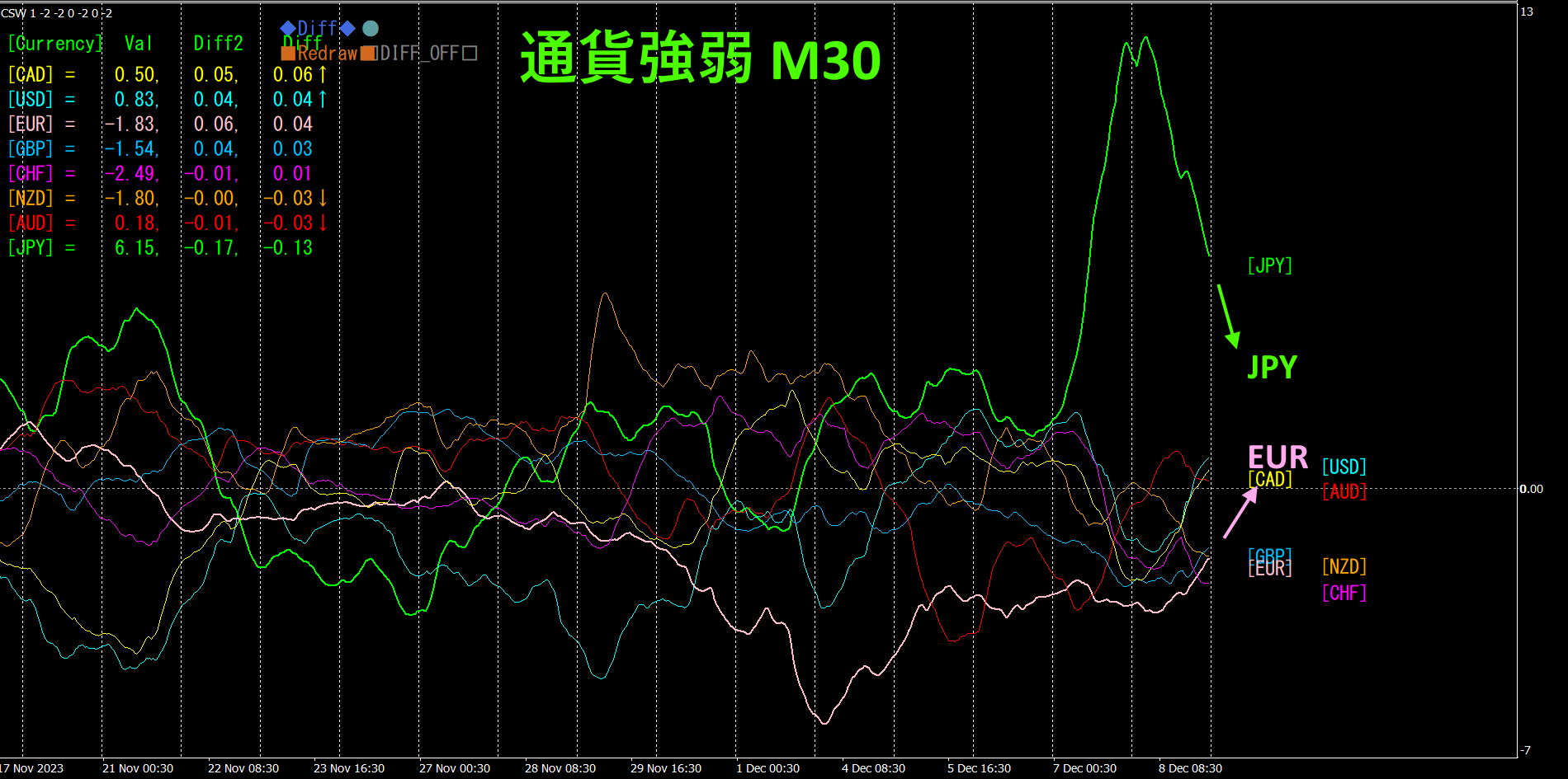 30分足の通貨強弱チャートです。