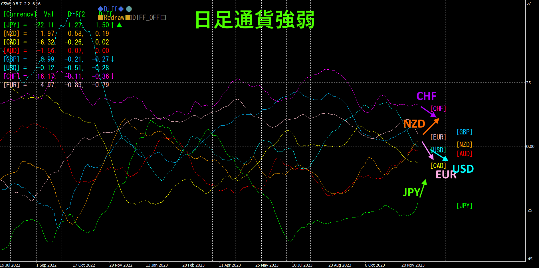 JPY、NZDが上向きです。EUR、CHF、USDは下向きになっています。日足では、JPYの上昇が著しいです。