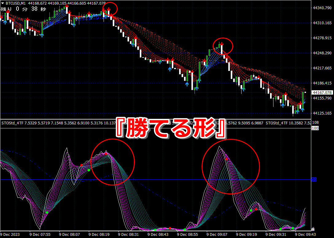 ② 矢印サイン点灯状態で、インジケーターのピンク色の帯が、緑の帯を下からすくい上げるような形状であれば、現在のローソク足が確定する数秒前か確定の直後に1分判定または3分判定でハイエントリーします。