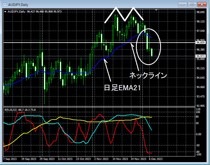 上の日足の白い楕円で囲ったあたりを見てみると、ダブルトップのネックラインをいったん割り込んでいることが分かる。下位足で戻り売りを考えてもおかしくない場面かもしれない。