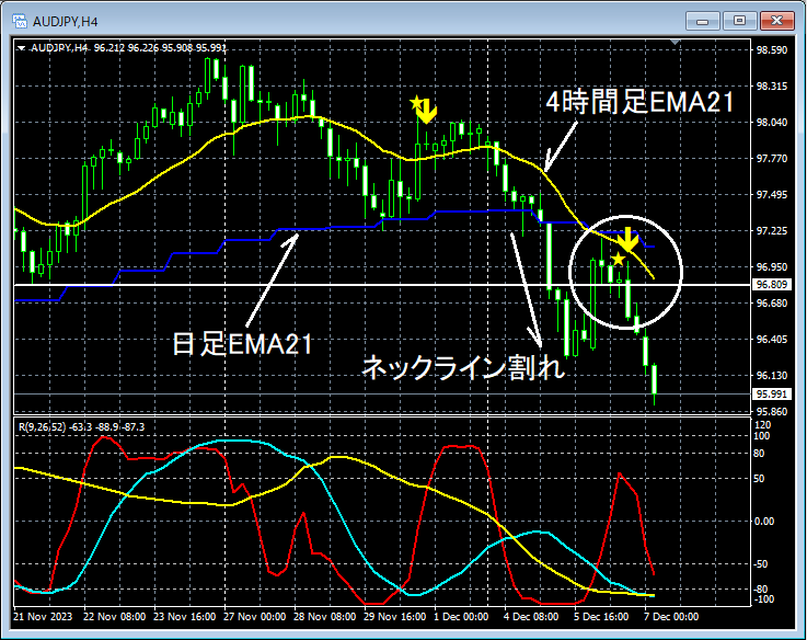 上の4時間足の白い円で囲ったあたりを見てみると、ネックラインをいったん割り込んだ後、日足EMA21と4時間足EMA21が重なるあたりまで戻したところでmBDSR(フィルター:RCI26とRCI52)の戻り売りサインが点灯し、その後、プライスは順調に下げている。