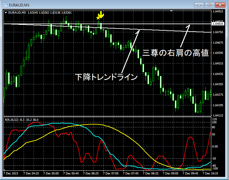 下降トレンドラインと三尊の右肩とmBDSR(RCI2本フィルター)の戻り売りサイン
