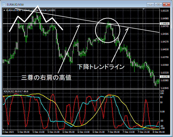 上の30分足の白い円で囲ったあたりを見てみると、三尊の右肩の高値と下降トレンドラインが重なったあたりまで戻していることが分かる。下位足で戻り売りを考えてもおかしくない場面かもしれない。