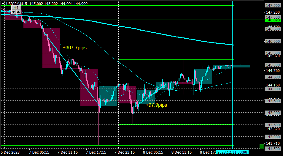 〇前日のトレード・USDJPY ドル円(15分足)先週の金曜は、強いと思われたサポート150.50を割り込んできたので、シナリオ変更しショート。ロング勢の損切りも巻き込んで大きく下げた。+71pips