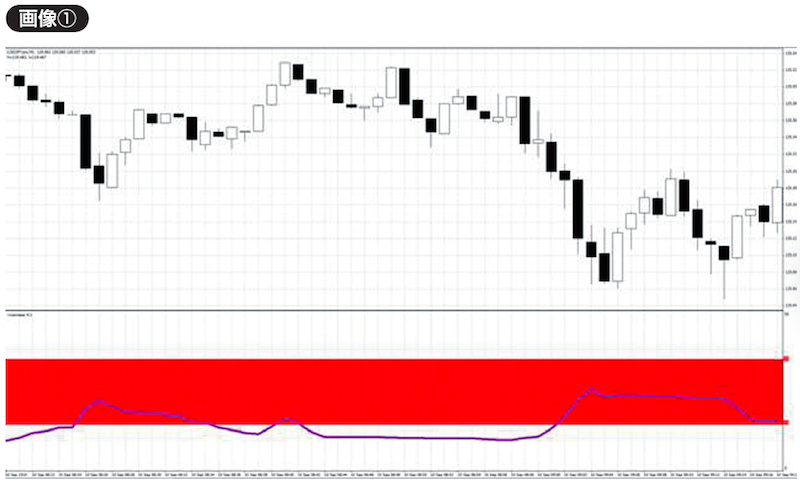 したがって、紫色ラインが赤色ゾーンに位置しているときが、トレードに適した時間帯になります。