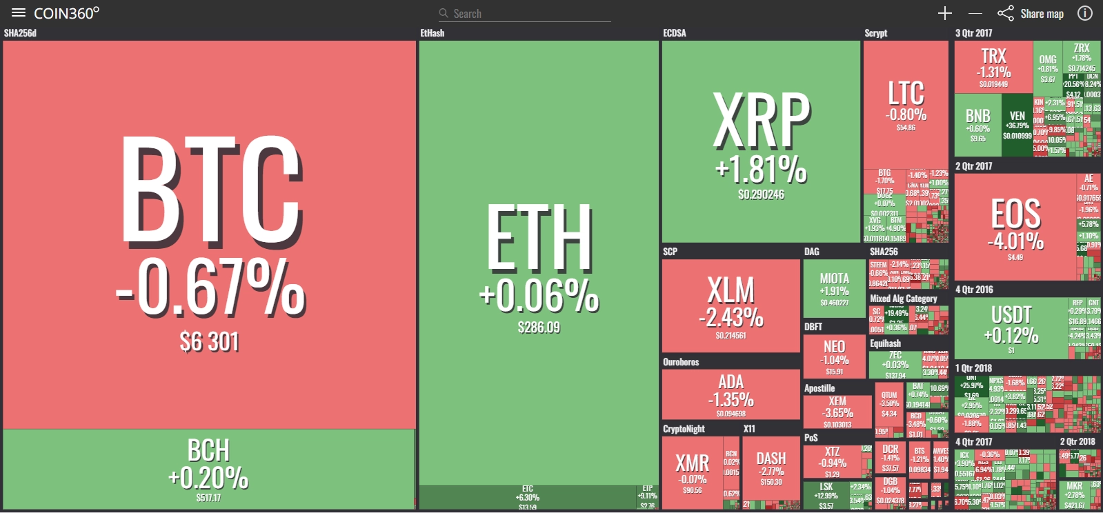 coinmarketcap(コインマーケットキャップ)のサイトから、ドミナンス(各銘柄が仮想通貨全体の時価総額に占めるパーセンテージ)を定点観測していきます。仮想通貨全般が下方向に大きく動き出している相場状況を受け、毎日更新することとし、仮想通貨業界を俯瞰および転換期を早期に発見することを目的とします。