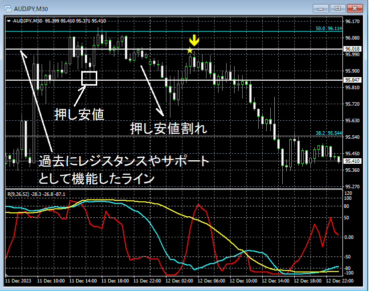 フィボナッチリトレースメントとサポレジ転換ラインと押し安値とmBDSR(RCI2本フィルター)の戻り売りサイン