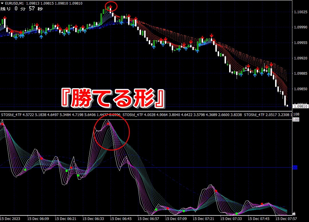 ② 矢印サイン点灯状態で、インジケーターのピンク色の帯が、緑の帯を下からすくい上げるような形状であれば、現在のローソク足が確定する数秒前か確定の直後に1分判定または3分判定でハイエントリーします。