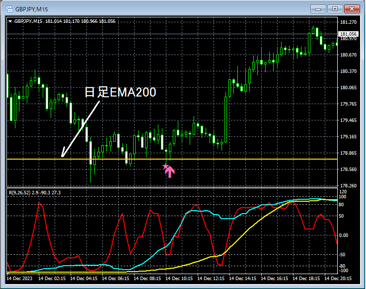 上の15分足では、日足EMA200を明確に下抜けすることができずにmBDSR(フィルター:RCI26とRCI52)の押し目買いサインが点灯。その後、プライスは順調に上昇している。